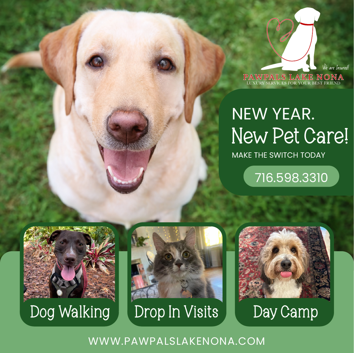 Dog walking. Drop in visits. Day camp. Help your pet stay active and engaged while you’re at work. Schedule a meet & greet to get started by calling 716-598-3310 or filling out our contact form.