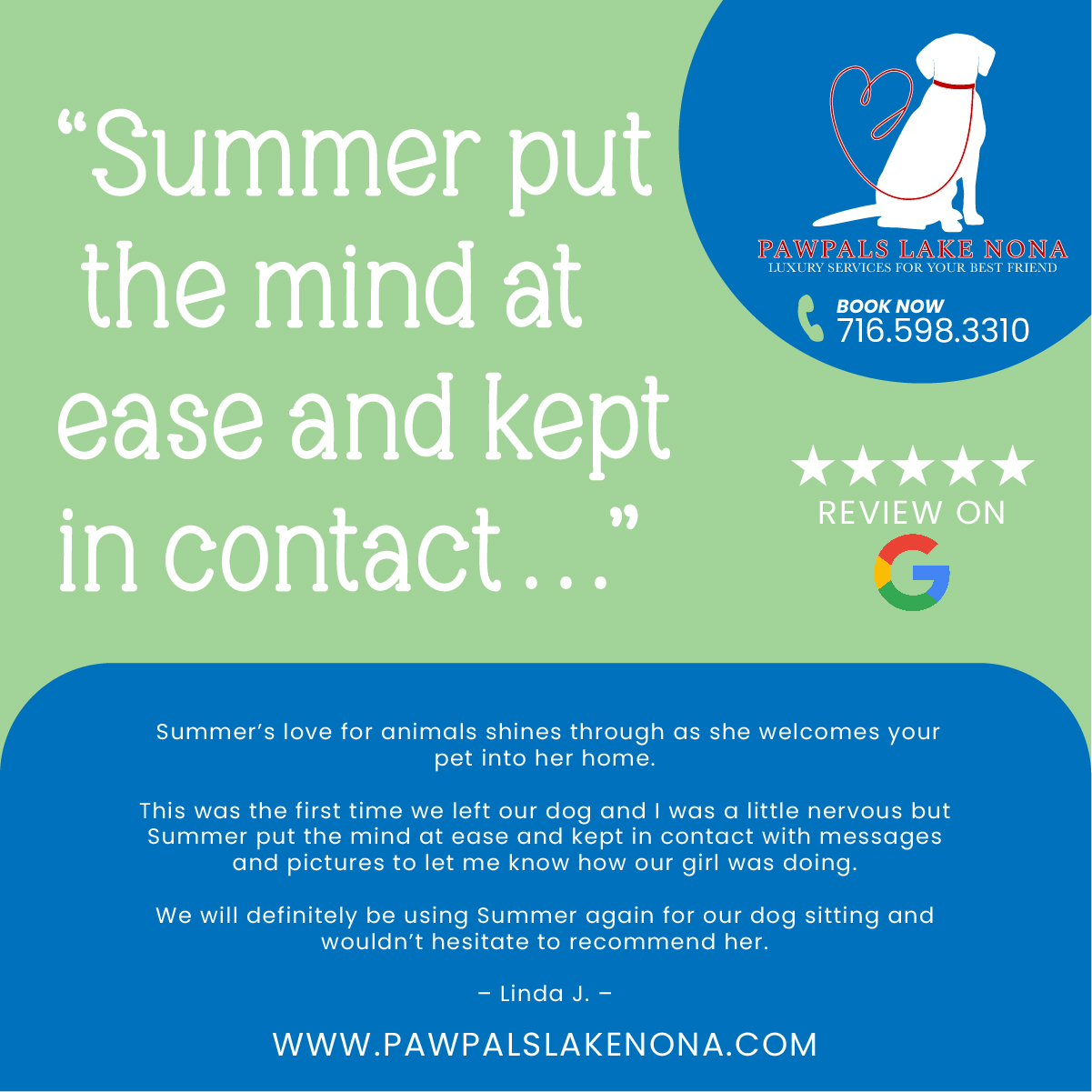 We will definitely be using Summer again for our dog sitting and wouldn’t hesitate to recommend her.” – Linda J.